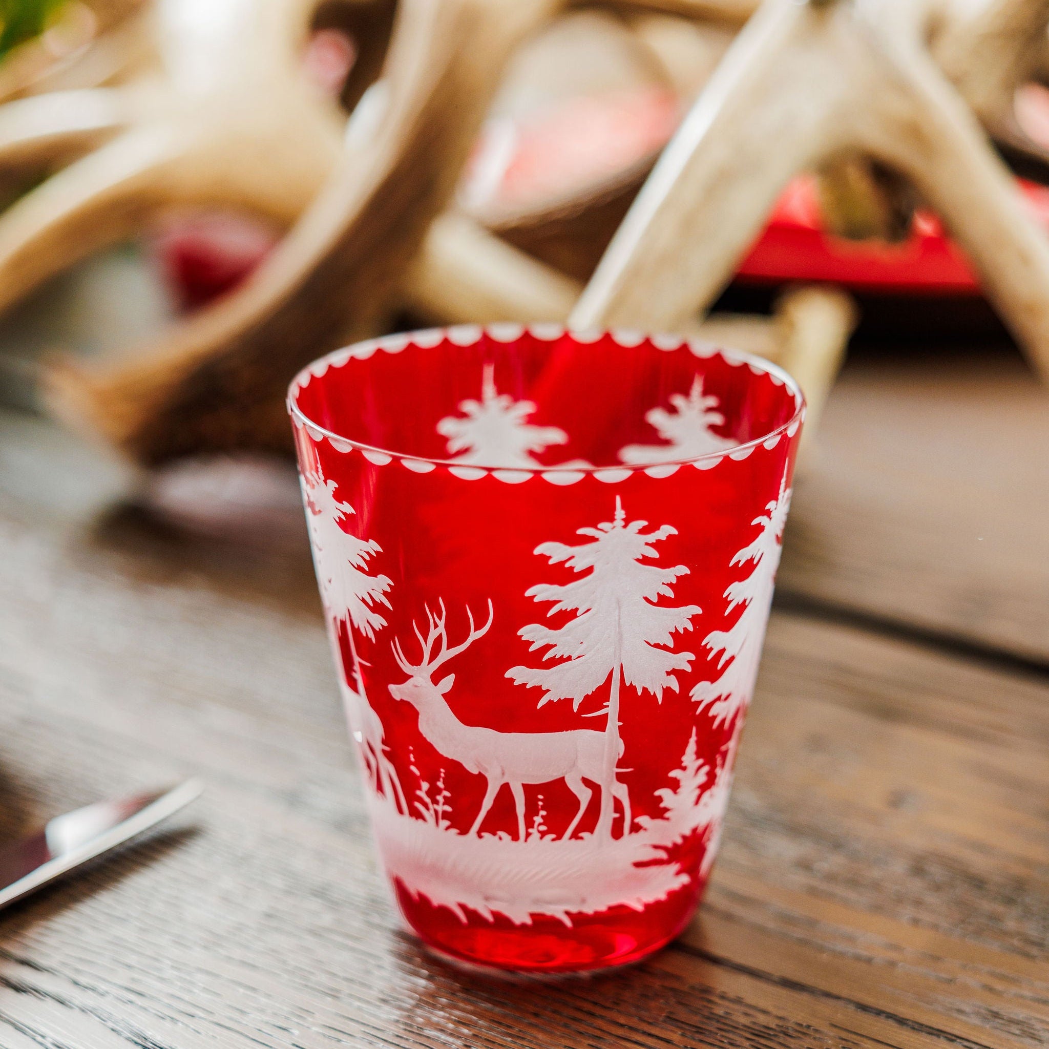Hand Engraved and hand blown crystal tumbler from Austria with a stag motif; stags and large pine trees are etched into the crystal wrapping around the tumbler.  Ruby red color throughout. These tumblers are exquisite.