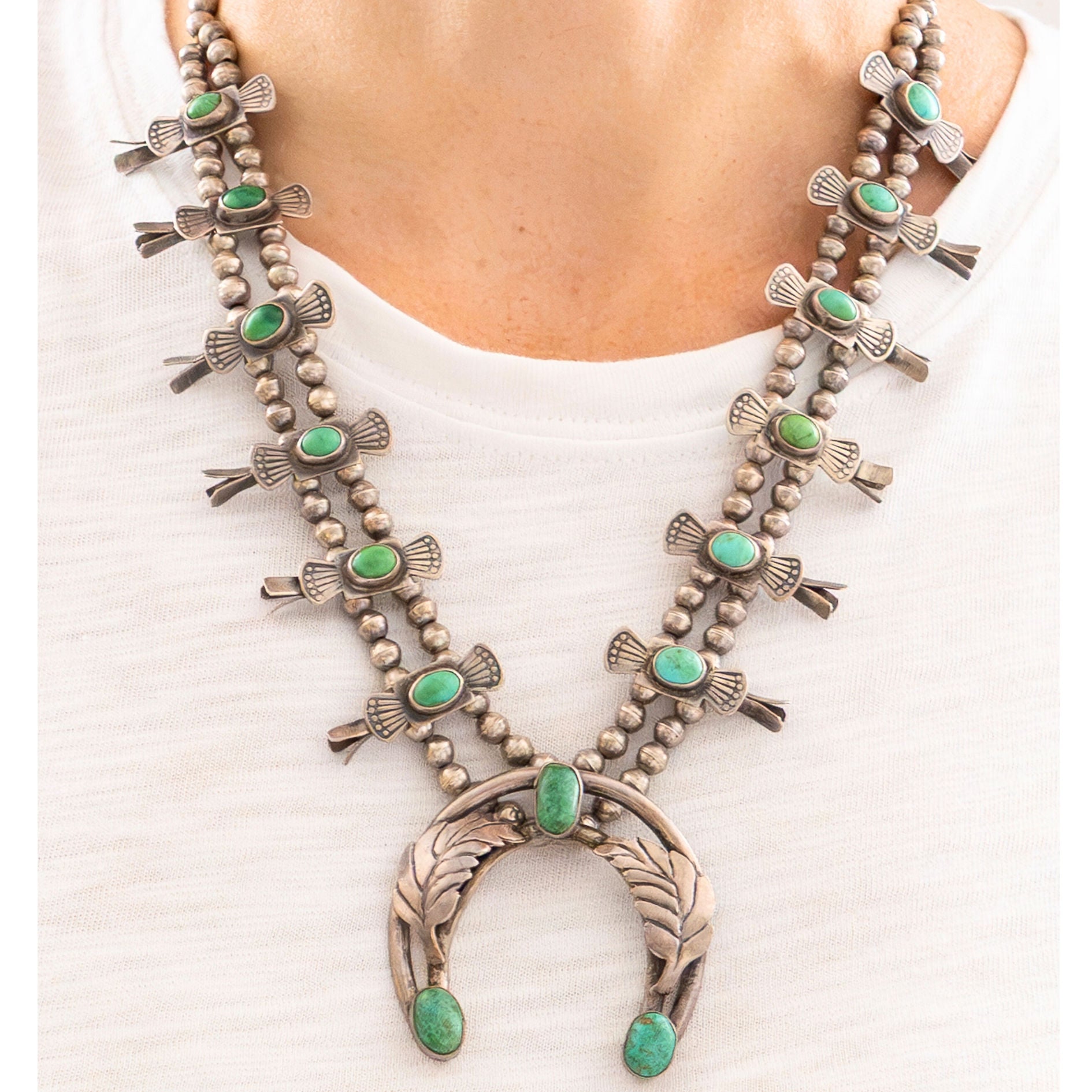 Squash blossom necklaces are often made with turquoise which is a symbol of healing, protection and connection to the earth. The Squash Blossom Necklaces feature a crescent shape at the bottom and symbolize status, strength and beauty.