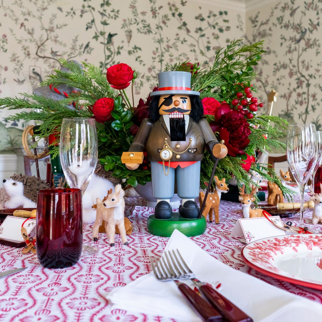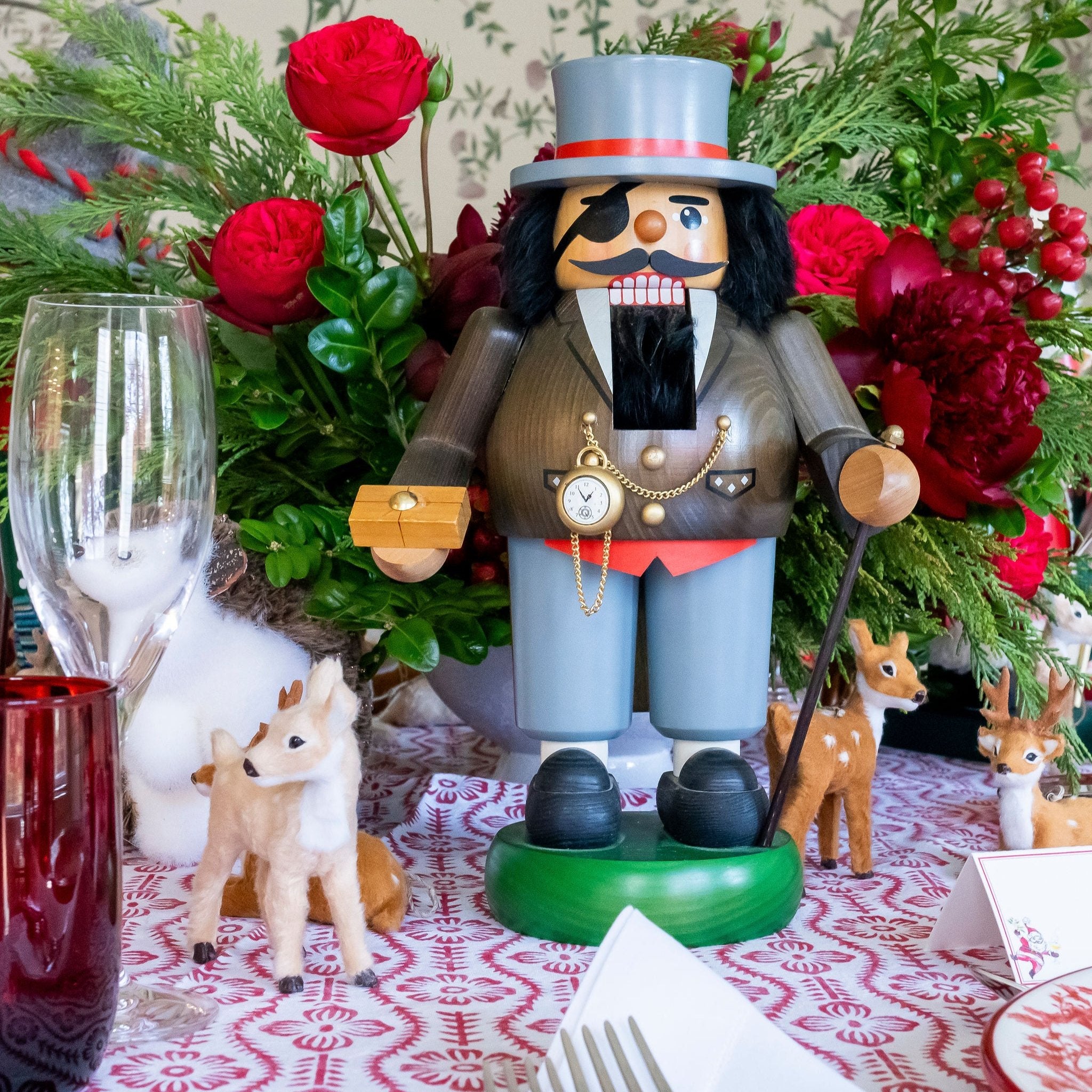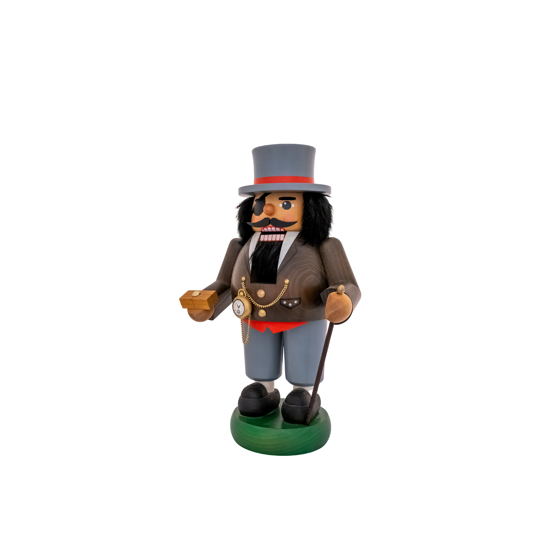 From his grey top hat, to his long hair to his eye patch this vintage time keeper nutcracker has personality! The most special part, aside from his particularly charming round belly, is the pocket watch that shows 12:55 and is complete with two delicate chains.